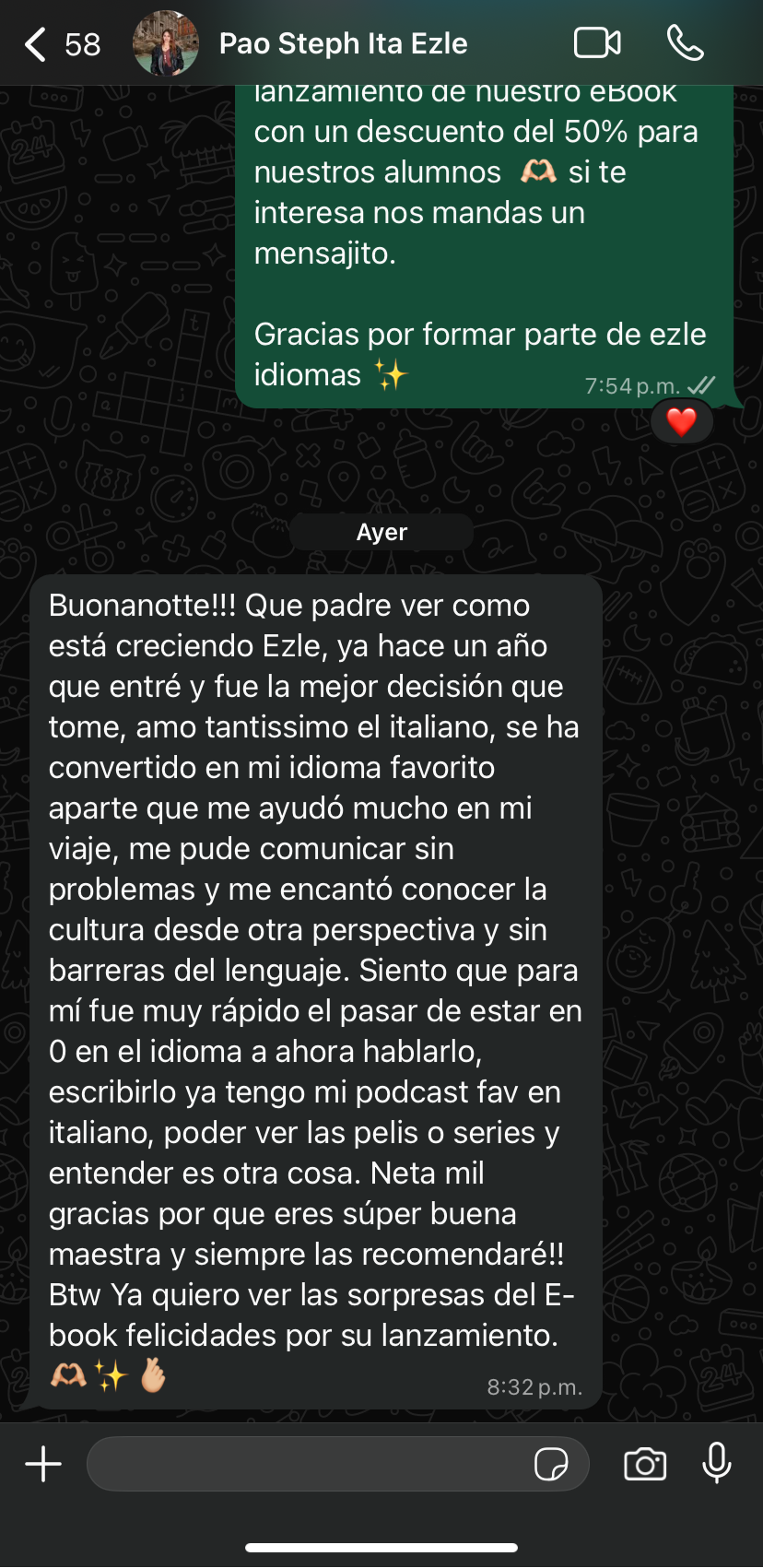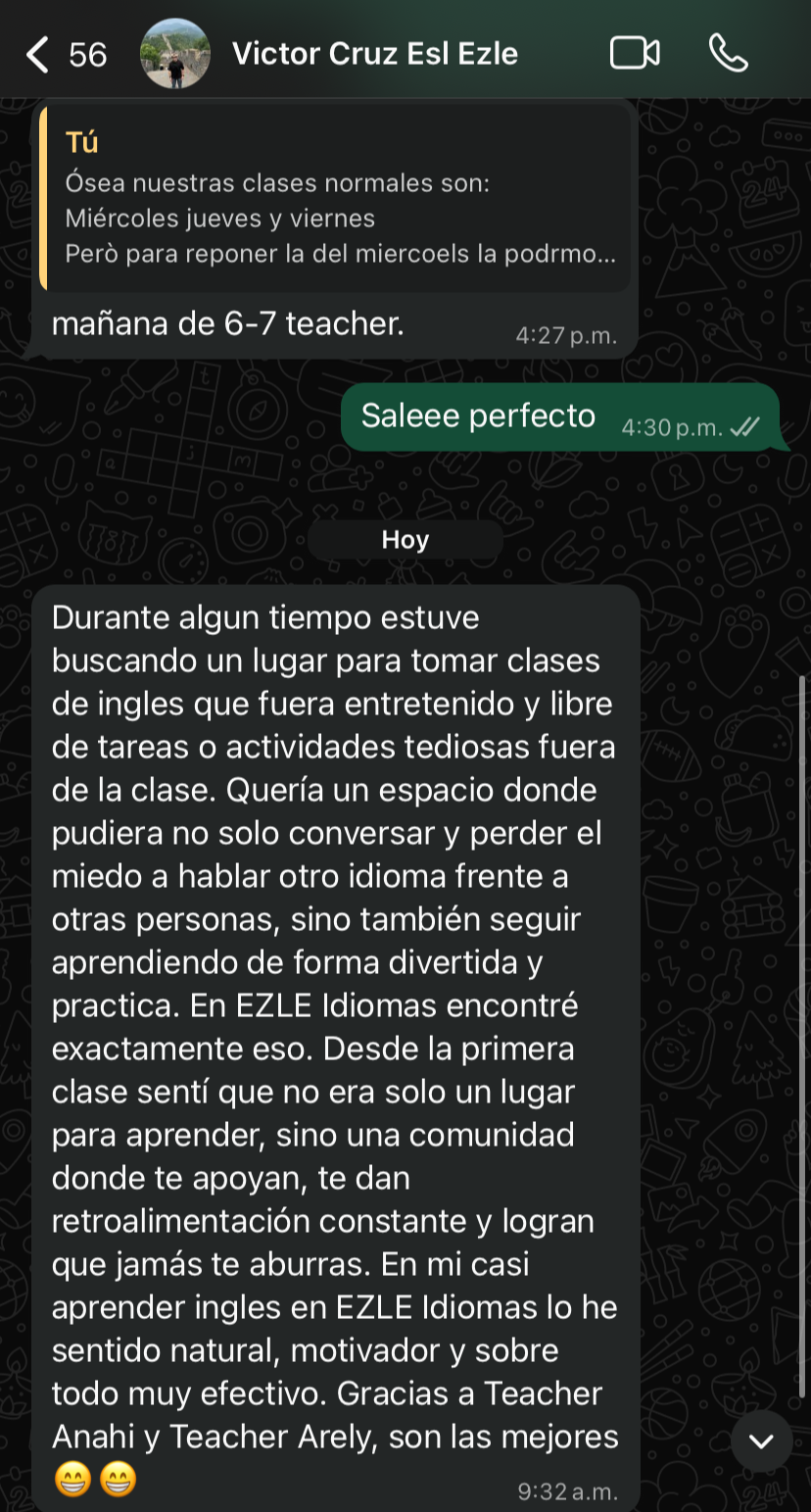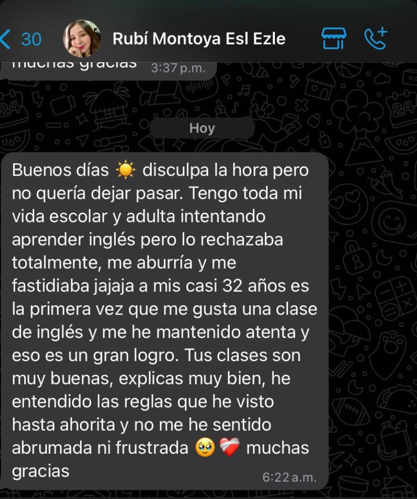 Gracias a Ezle pude reforzar mi inglés y sentirme más segura al usarlo tanto profesionalmente como en mi vida diaria. Las clases son prácticas, dinámicas y muy bien enfocadas. ¡Estoy muy agradecida por todo el apoyo y la dedicación, gracias Arely y Anahi!