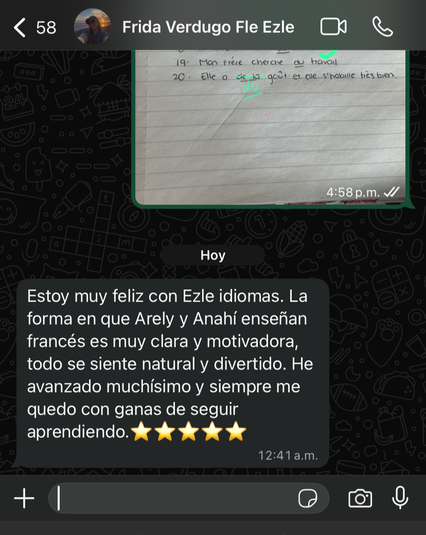 Las clases que tomé de inglés y francés en Ezle Idiomas me han ayudado mucho a tener confianza al comunicarme con otras personas, aprendà lecciones de gramática y me gustó que las clases eran muy dinámicas. Las maestras te enseñan de una manera muy agradable y siempre respondÃan a todas mis dudas. Sin duda puedo recomendar a Ezle Idiomas si quieres aprender un nuevo idioma con horarios y clases flexibles que se acomodan a tus tiempos, con temas y juegos divertidos.